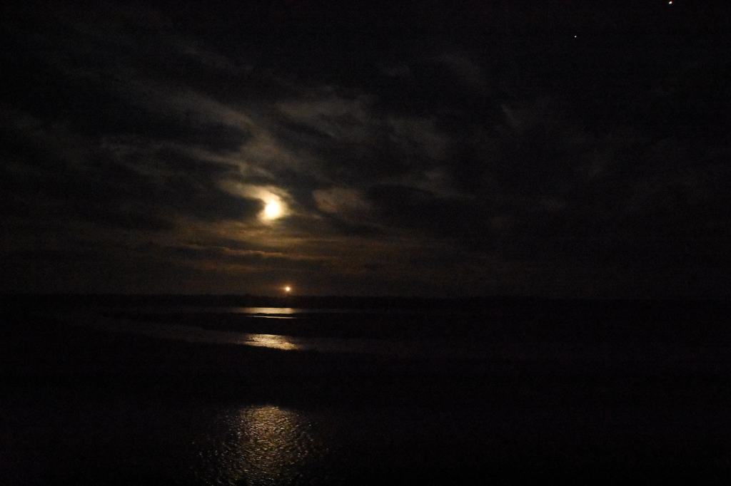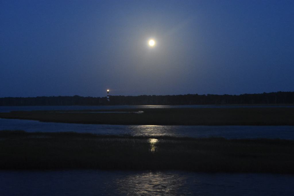 Between the balcony of our second floor rented apartment and the Assateague lighthouse a mile east, white chop scalloped three bands of water and combed two stretches of marsh; brilliant green in yesterday’s sunlight, they were vanishing under water racing right to left, south to north. A gull walked on the dock below; where we’d waved at crabbers the past two afternoons it was empty of people now. I saw the bird tense its body as gust-hiss rose, tuck its wings tighter and spread its feet to stay upright. Other gulls rode the fast-moving water; some seemed to fight it, but only by flying low on frantic wings could they move through the roar.