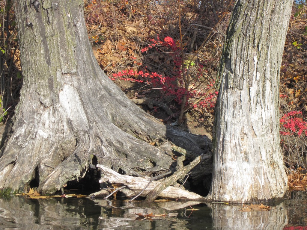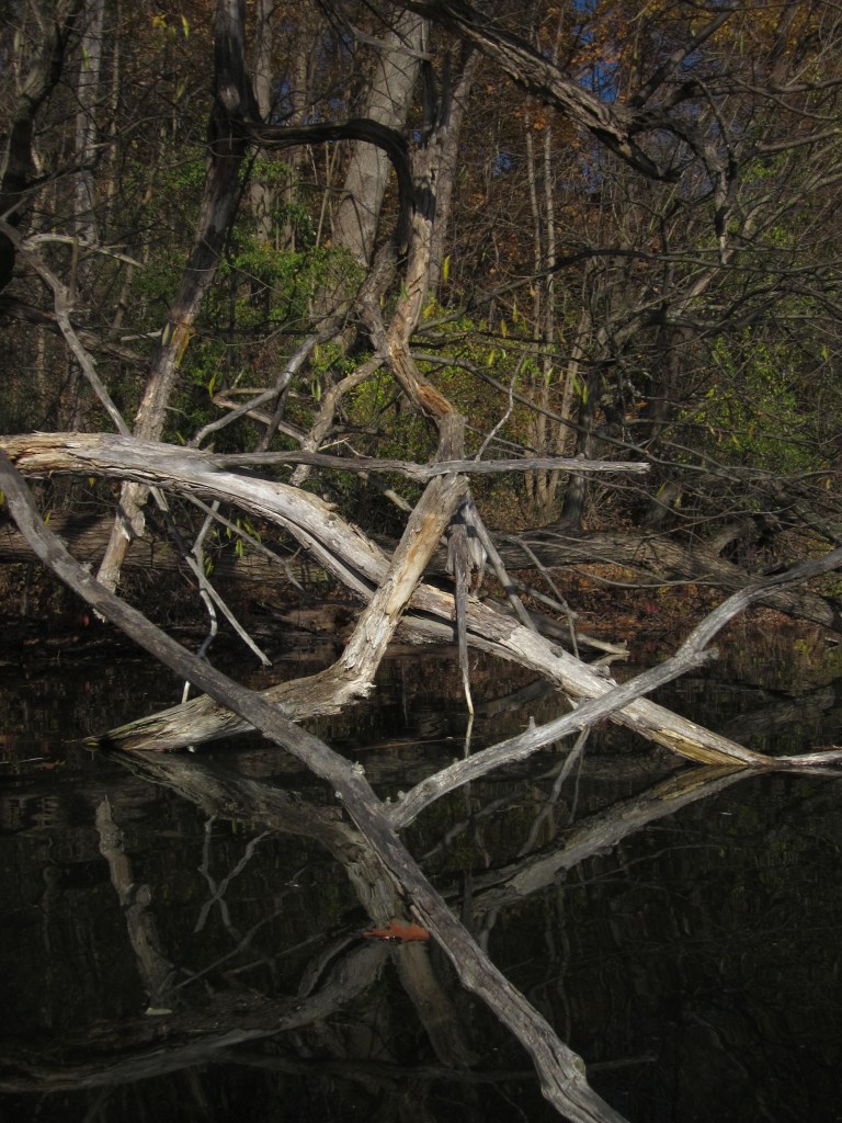 Relishing the ease of paddling anywhere, without water chestnuts to grip the paddle, slow the hull, I stayed in-shore a lot, spooking slate-gray carp that cruise the shallows feeding. When the water moved in a shady spot overhung with trees, I thought I was seeing the mellow, ancient snapping turtle I’d often spotted there, moss thick on its shell. As I got closer, I saw it was a carp, foraging in water so shallow its spine broke the surface, triangle head swinging restlessly right and left. Logs along the shore bore “W’ webworks of turtle-claw scratches.