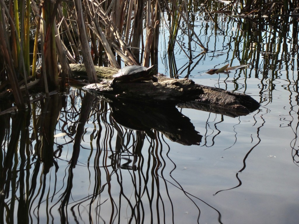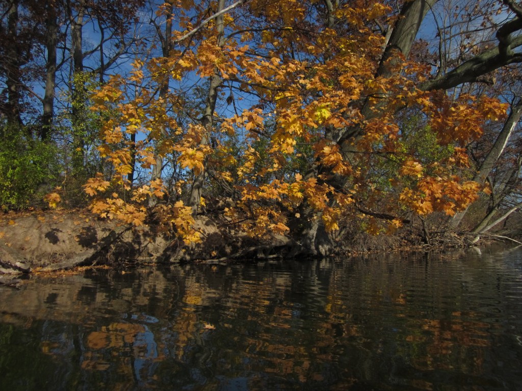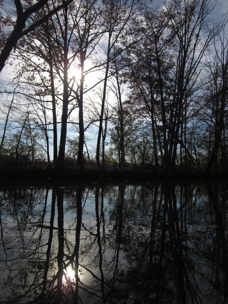 The water was colder than I expected as I walked the boat in. But the sun warmed wet feet and legs as I set off onto mirror-y waters transformed by the season-change since my last paddle there, more than a month of cold wind and wild rainstorms ago. All the green, grasping vegetation that made the south bay a real challenges to paddle through earlier had died back away. Sadly, so had the water lilies that once decorated the lake. This left the water clear and sweet, the paddling easy. I slipped past reed and cat-tail forests in the south shallows, past a woman who sang out, “Is that a Hornbeck?” and said her beautiful canoe is a Slipstream, an emerald-green blade in the water.