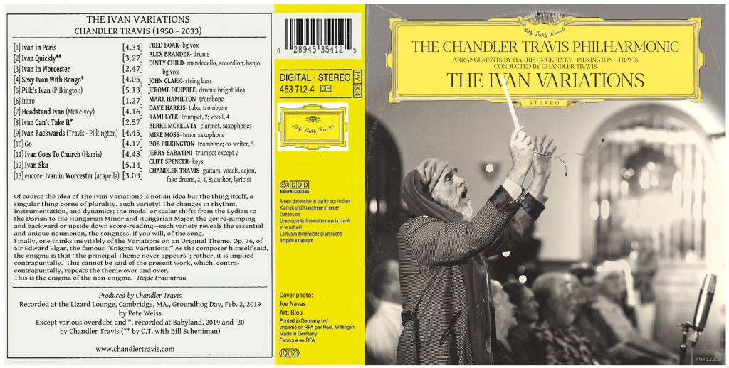 The Harwich, Mass. (Cape Cod) resident (who celebrated his birthday Monday, March 15) recently said by email he’s busy recording “Great dollops of new stuff from the Philharmonic the Three-O, and the Catbirds,” all bands that he leads and for which he writes and arranges nearly everything. This hyper-activity follows a highly productive 2020 when “we put out quite a bit of new stuff…by the Incredible Casuals, myself, Travis & Shook, Paulette Humanbeing, Pete Labonne, and the afore-mentioned Catbirds, Three-O, and CTP.” Travis said most of this new music is available for free on the merchandise page of his website. Like “The Ivan Variations” by the Chandler Travis Philharmonic (there’s also a smaller Philharmonette, but I digress), this music is available directly at www.chandlertravis.com, also at iTunes, Spotify, Amazon and band camp.