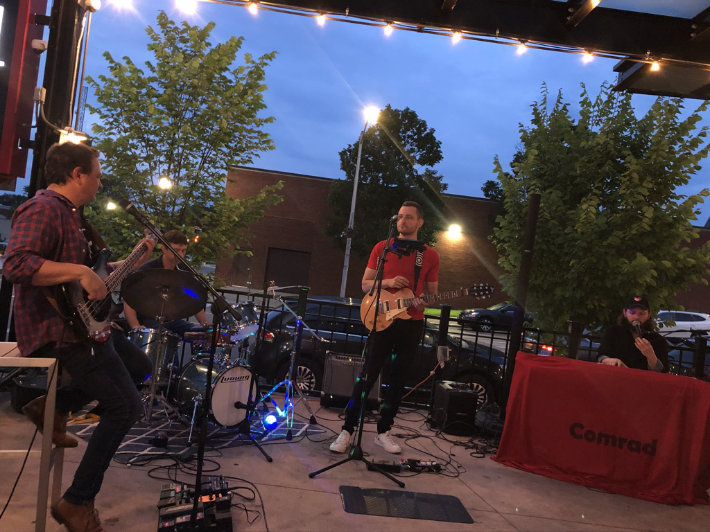 The electric bass on the bandstand was Dave Parillo’s, Zak’s friend since pre-school at Brown School when it was still on Rugby Road. Boston-based Dave was there to play with friends from Niskayuna High School and Ithaca College. Their quartet Comrad had practiced together online until recent all-vaccinated rehearsals in Brooklyn where most of them live.