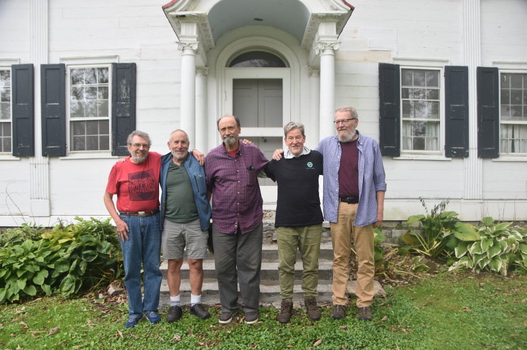 Old Vets’ Reunion – From left, me, Schmuel “Stuart” Ferency, John Collins, Steve Bouck, “Lew” (Michael Ayres) in Newville, NY; fall 2021. Ferency lives in Hull, Massachusetts, Collins in Newville or Albuquerque, Bouck in Muskegon, Michigan, and Ayres in Eau Claire, Wisconsin.