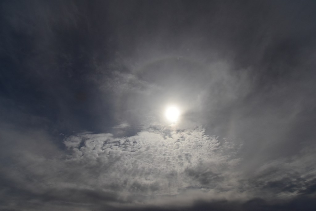 We defined “fermata;” might as well do “parhelion.” Merriam-Webster defines parhelion as “a bright spot, often with color, that appears on the parhelic circle on either side of the sun…also known as a sun dog.” Shown here, for reference, is the one that formed around last week’s eclipse, as seen from a farm road near Little Falls.