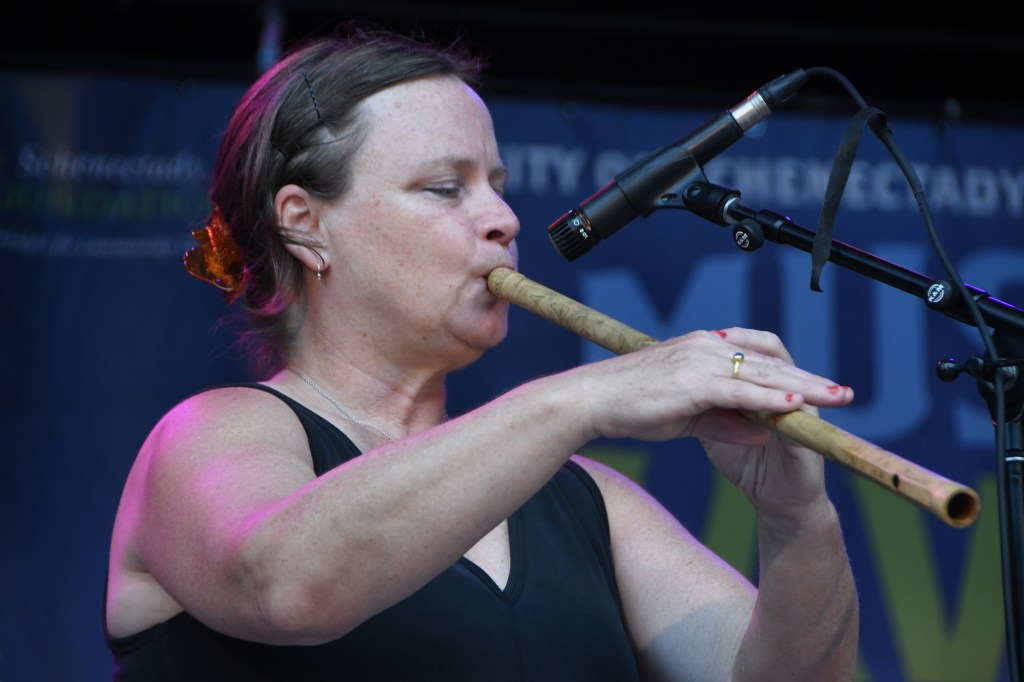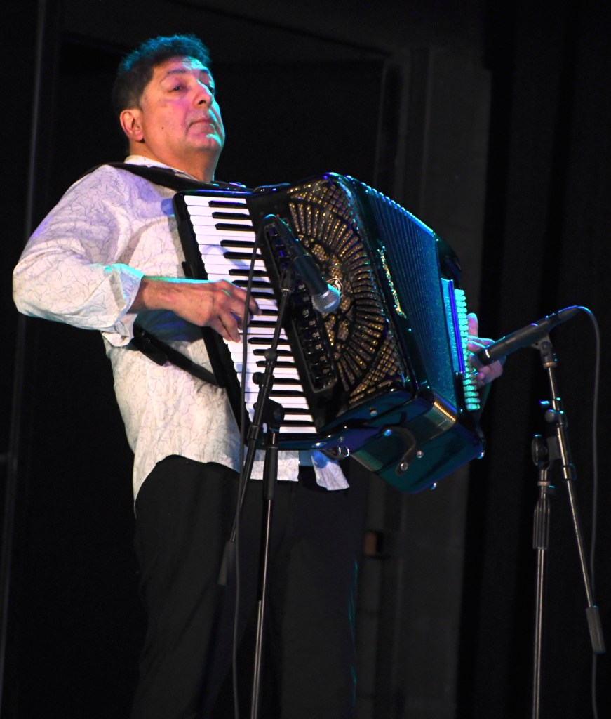 Accordionist Peter Stan anchored stage right, next to alto saxophonist Peter Hess, then trumpeters John Carlson and Kenny Warren and trombonists Adam Dodson and Tim Vaughn. Moran gradually introduced everybody by calling each to solo, bursting out of tight section playing to soar fine and far. Accordionist Peter Stan dazzled in an unaccompanied, all over the place, dynamic intro to “Nisovacko Kolo.” The solos flexed personality, drive and daring; and when everybody ganged up on a tune together, the effect was tidal like a big-band reed or brass section roaring unanimously to steamroll the place.