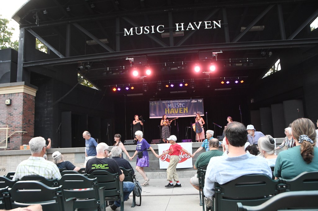 At times, lines of dancers linked hands and slide-stepped across the dance floor up front, then roamed around the edges of the seating area, recruiting new dancers who quickly learned the steps. Or, not.