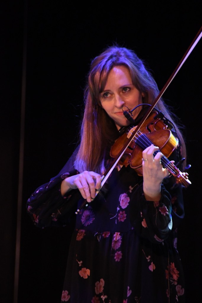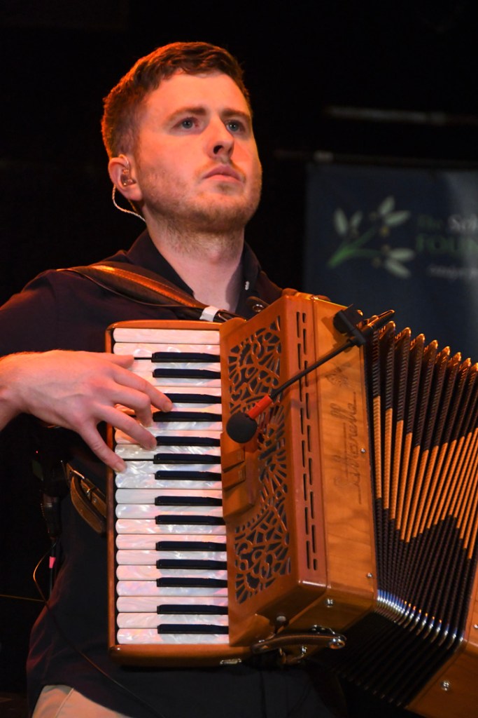 Goitse’s arrangements brought a fresh feel to dance tunes by aligning Conal O’Kane’s strummed acoustic guitar with Phelan’s bodhran (circular hand drum) played with several different-sized sticks; as Alan Reid’s banjo set up a cheerful, treble bridge between. Daniel Collins beefed up the beat when he shifted occasionally from keyboards to accordion, going low on the chord buttons while fingering melodies on the piano side. A late fill in on this tour, fiddler and singer Joanna Hyde proved highly compatible, confident and commanding. Soloing on most tunes, she sparkled at the mic also, going poignant in “Ireland’s Green Shore” early and later wryly introducing “Belfast Love” as one of few happy Irish tunes.