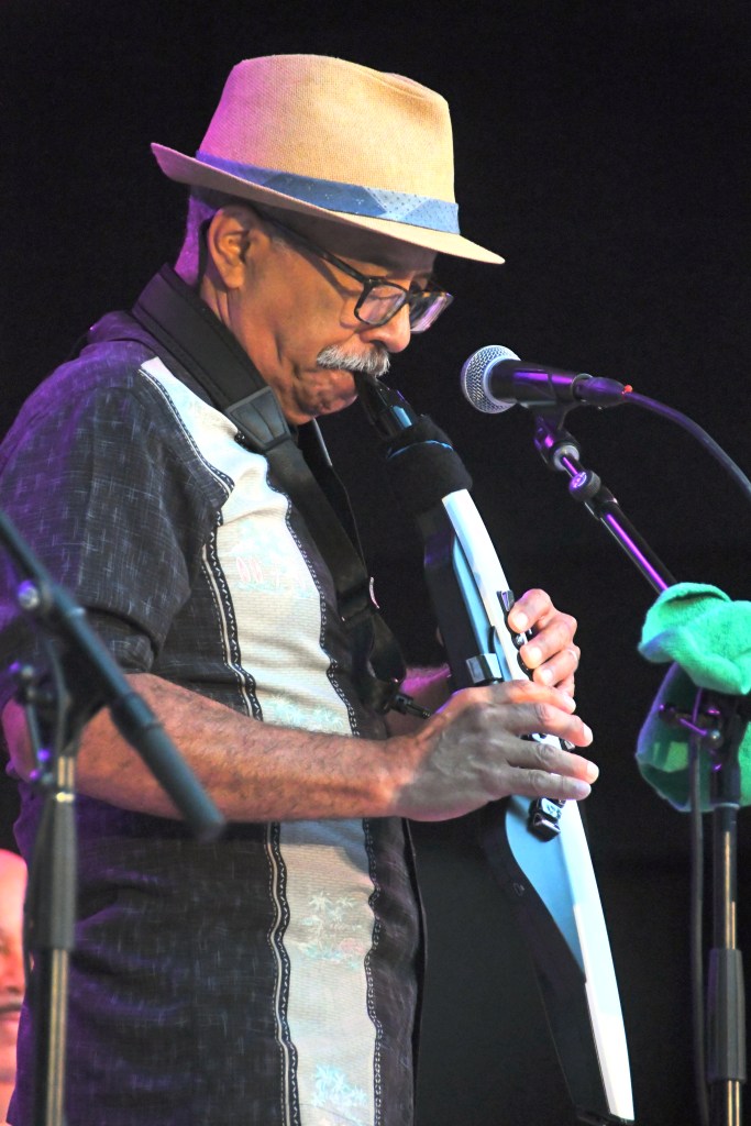Early on, the bolero “Creo En La Naturalize” and the relaxed rumba “Arazo De Luz” slowed the pace, before “Aniata Tun Tun” revved things up again, vocal chant and trumpet echoing each other in beat and melody and Ochoa smiling as he sang. He handed the lead over to his young keyboardist; but his own guitar and trumpet soloed most often and usually introduced the tunes. While the melodies and beats varied, the performing dynamic had a compelling consistency: Launch-pad intro, verses and choruses of vocal leads and group chants, some solos, then coda. The show had pace and punch as Ochoa seemed to grow more relaxed from song to song.