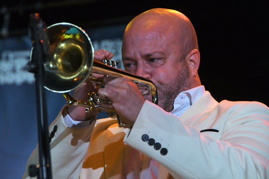 Singer-trumpeter (actually a plastic synthesizer construct, like an EWI for brass effects) led an ensemble so unified in its Latin-party mission that bandleader Alex Torres, whose Latin Orchestra seems to play every night this summer, took his place in the groove rather than up front. Torres played bongos and cow-bell in a swirl of acoustic guitars, electric bass and percussion.