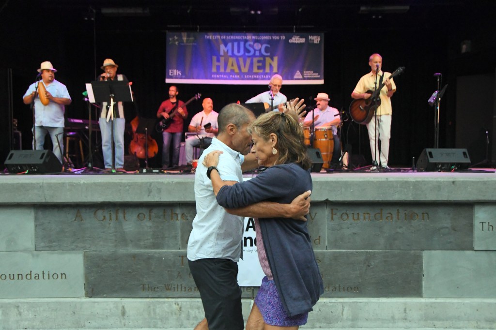 The evening began with Music Haven’s Summer Social – full disclosure: I was a paying customer – in the Tom Isabella picnic pavilion. After dinner, the pavilion’s name-patron took his customary volunteer spot, selling raffle tickets. In both the pavilion and on the main stage, Schenectady City Engineer Christopher Wallin was honored as 2024 Music Haven Maven for his leadership in upgrading the Music Haven venue and other Central Park facilities. Full disclosure #2 – Music Haven impresario Mona Golub conferred that same honor on me in 2017.