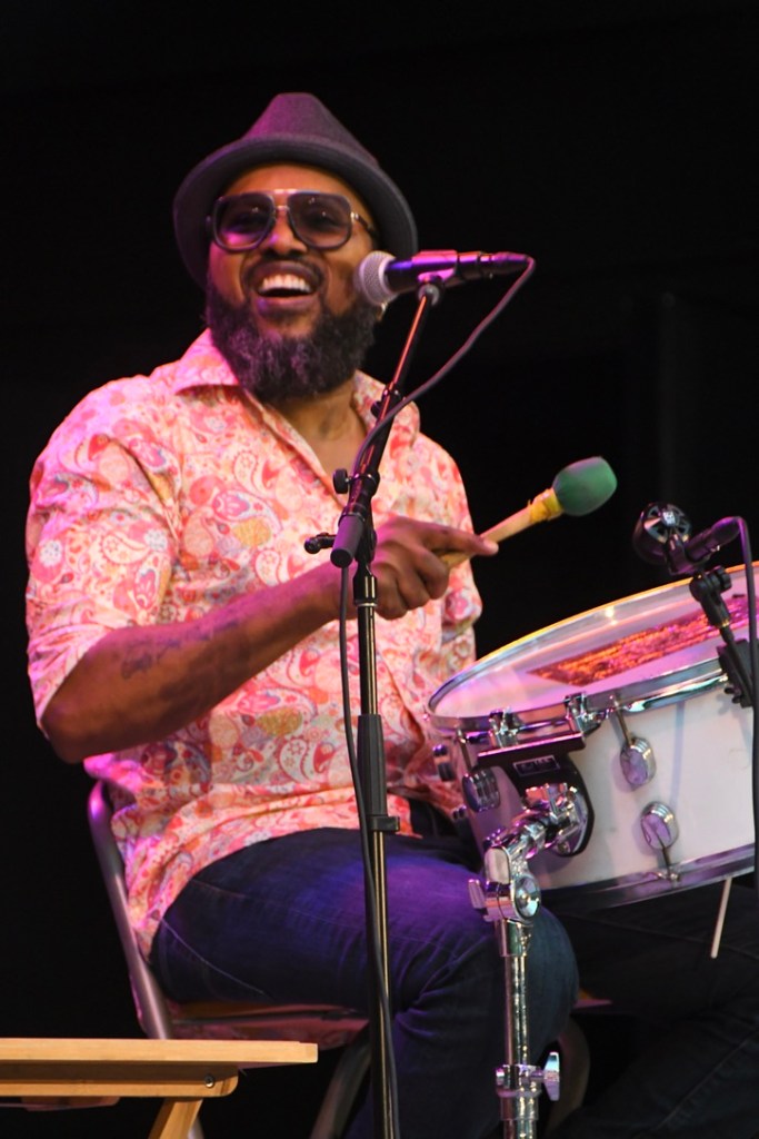 She started quietly enough, airy extended high-chord bowing by violinist Darian Donovan Thomas (in red socks, pleated kilt and giant ‘fro) with delicate riffs by longtime guitarists Bob Lanzetti and Ignacio Hernandez. Mark Vanderpool’s bowed bass and Murph Aucamp’s vibes built a quiet, meditative mood under these stringed things and Magda’s ethereal voice. A brief pause, then the guitars surged into solo swapping, Magda strapped on her accordion and the band jelled in power and purpose. Later, Aucamp mostly played drums, except in a vibes duet with Magda; he played a duet drum break with Vieira.