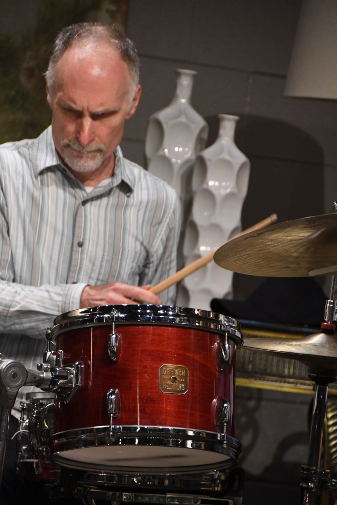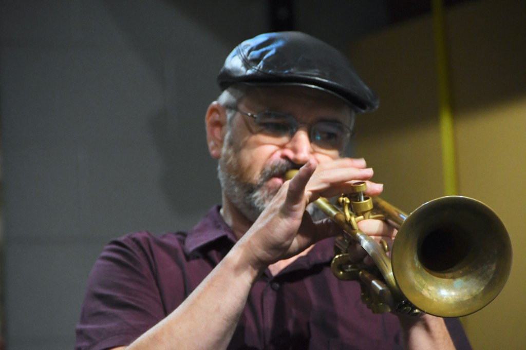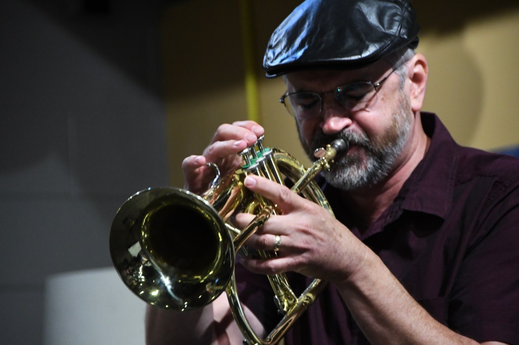 Slower and softer flowed “Flowers That Beckon,” so soft that when photographer Rudy Lu sneezed in his front-row seat, Sweeney looked up from his drums to say “Bless you.” Quiet laughs all around. Playing mainly on toms, with mallets, Sweeney popped a more assertive groove as Gordon conducted a correction to the blend, then his flugelhorn pumped the melody hard as he revved everybody to follow.