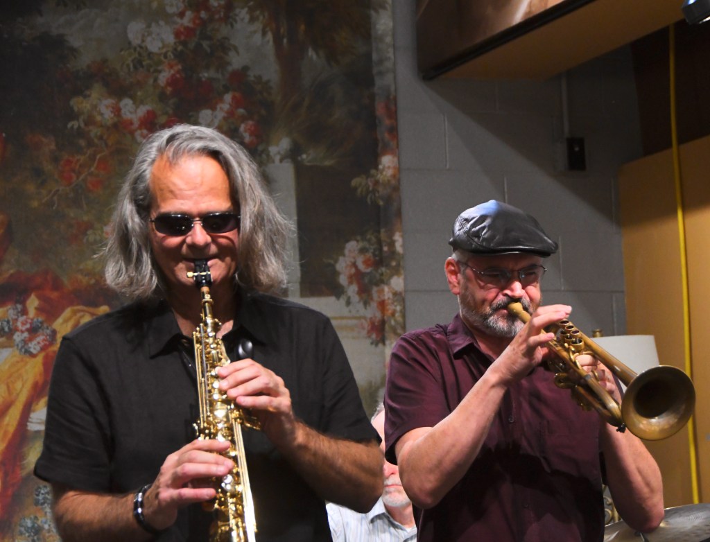 Gordon’s trumpet opened alone in “Quarantine” (a Covid tune, as he explained), before Walentowicz’s tenor commented and went further outside; further, that is, until Gordon went raspy in his own solo before playing clean and clear again.