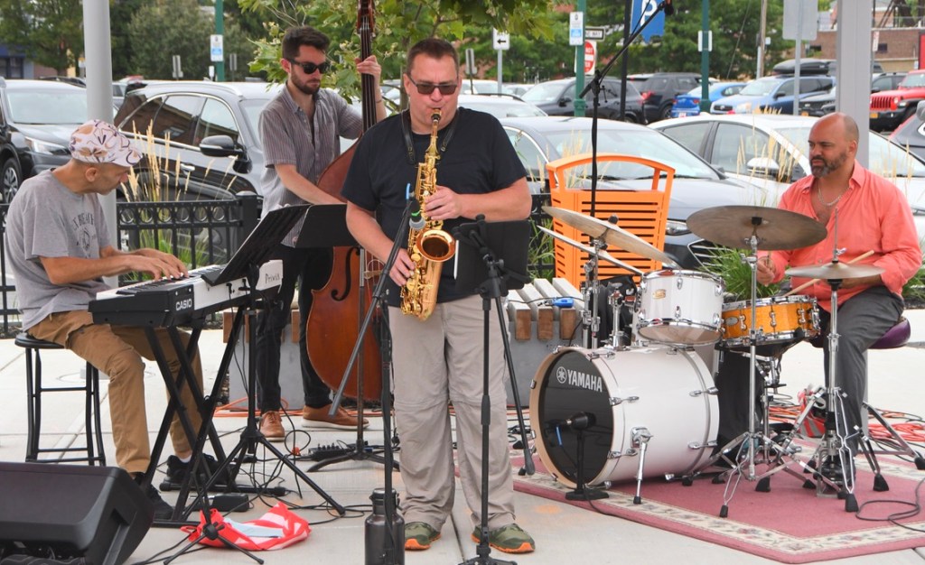 In late August, Joe Barna, right, led a different version of Sketches of Influence to close the season at at Jazz on Jay; from left, Ian McDonald (sitting in for David Gleason), keyboard; Jason Emmond, bass; Keith Pray, alto saxophone; and Barna, drums and cymbals (as he prefers to be credited.)