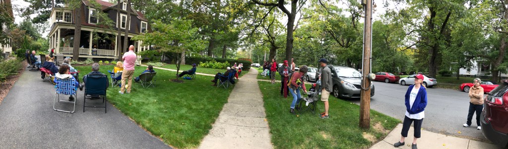 “Part of its charm came from the fact that it wasn’t big; none of the four porches drew as many as 100 people. Crowds were fluid, flowing from porch to porch. Musicians gazing at sparse throngs wondering “Where is everybody?” soon got their answer as parades of lawn chairs showed up. Hosts deployed chairs, some handed out blankets, and a balloon-festooned sidewalk birthday party on Ardsley spilled over generously into Porchfest, sharing cake, custom mock-tails and a block-party welcome feel to music-fan strangers.