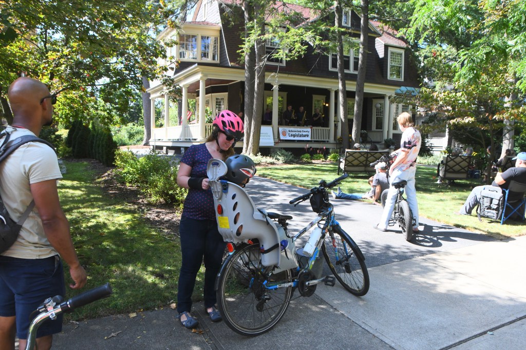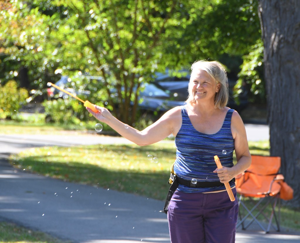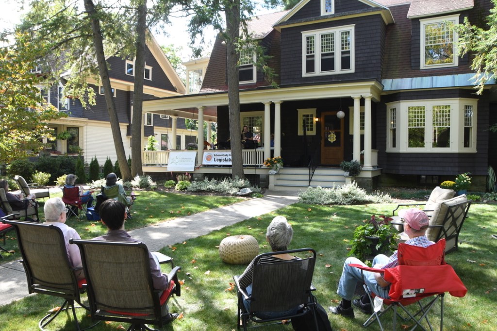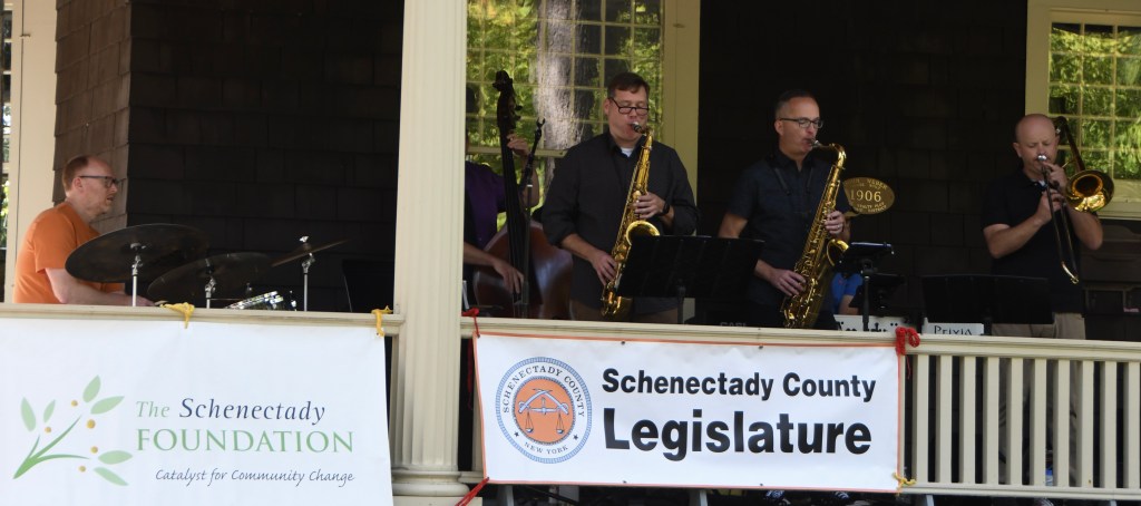 I also missed the Oneida Middle School Guitar Club; fans’ videos showed teens shredding Black Sabbath and Nirvana nice and loud, with their teachers in support. And my only sense of Backyard Brass was spotting its trumpeter and Porchfest organizer Steve Weisse in the band’s trademark lederhosen and Tyrolean hat as he buzzed around paying the musicians with funds he’d secured through grants. Hats off, a squeeze of the sunscreen tube and a toast with a cold one to Weisse, the funders, the porch-hosts and especially the musicians and fans of Porchfest 2.