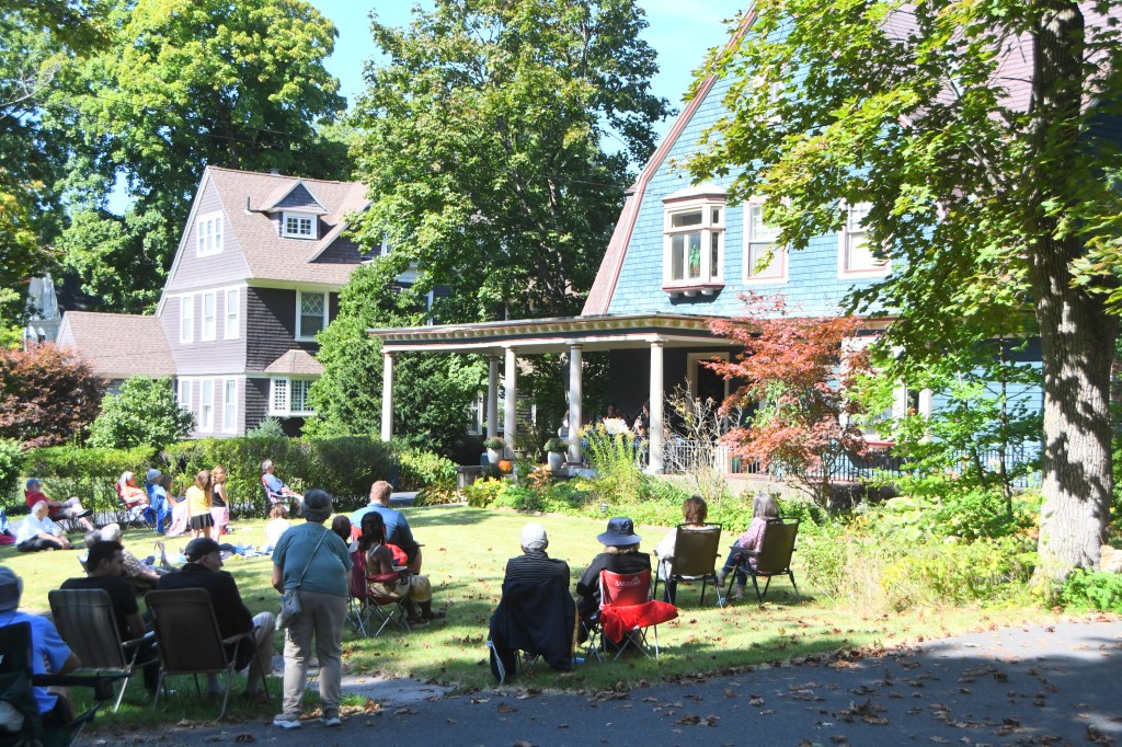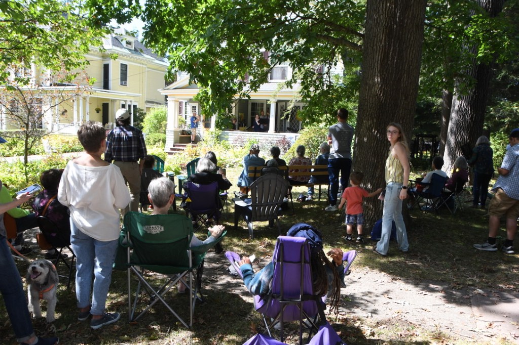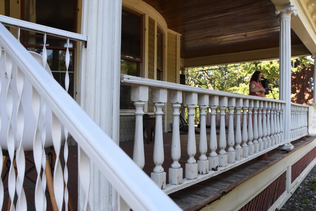 On that same porch, just before Valente, came Porchfest’s most powerfully poignant moment. Nice Hockey bassist Chad Rogers came down with COVID Saturday morning, but I heard later that he managed to play anyway. He set up his bass inside the house with his amp outside where his bandmates played on the porch, his porch. Informal Sunday morning acoustic jams on that same porch during COVID provided the idea for Porchfest, with its wonderfully generous idea of giving away music to anybody who wanted to come hear it.