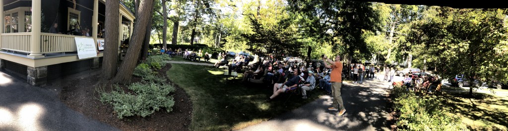 From Fay’s quartet gig on Stratford, the Kevin Carey Group played around the corner at 1226 Wendell, a new venue this year. I missed the Epilogue chamber-jazz trio there Saturday, although I’d enjoyed them last year. Wendell was the biggest lawn and Carey’s was the biggest band: two saxophones, trumpet, trombone, piano (Carey), bass (Shoudy, in his second of three shows) and drums. Fans flowed in from other porches, seeking shade under both tall trees and a blue pop-up tent. The all-star septet exploded with Monk’s “I Mean You,” then shifted into Carey originals “Easy and Blue” (well-named) and others. Each showcased strong section playing and aggressive soloing, especially by Keith Pray, alto; Eric Walentowicz, tenor; drummer Bob Halek and Carey himself.