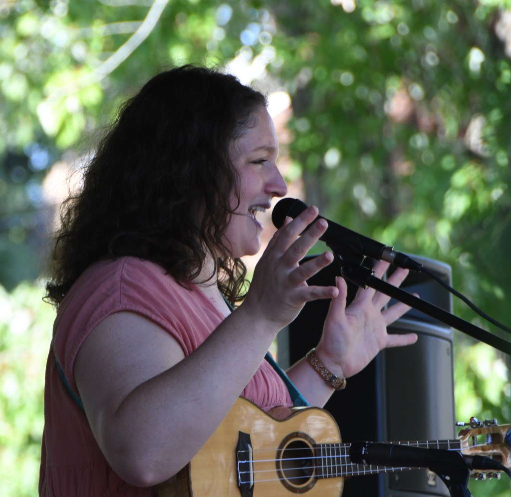 No contrast all day felt so stark as that between McLoughlin’s trio and troubadour Angelina Valente, one of two Porchfest closers. Her solo set on Ardsley was my choice over Mike Benedict’s Jazz Vibes (featuring three-set iron man Mike Lawrence) since I saw Benedict’s band recently, but I hadn’t heard Valente since the Eddies in April when she and I both won.