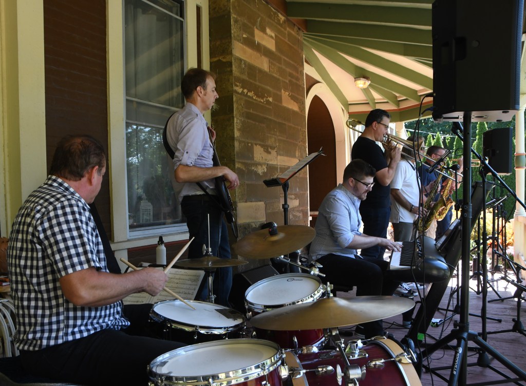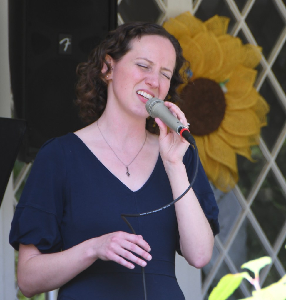 Between those two brass bands at opposite ends of Porchfest, time-wise as well as geographically, Kaitlyn Fay sang with her Quartet at 1183 Stratford Rd. The first of drummer Cliff Brucker’s gigs, with bassist Dave Shoudy and pianist Wayne Hawkins, this found Fay in an exploratory mood unlike artists who relied on favorites. Between the swing classic “Day By Day” and a bouncy “Señor Blues,” she introduced her own lyrics to Milt Jackson’s “3000 Miles.” After “Blues,” she uncorked “The Love In Your Eyes,” a collaboration with keyboardist David Gleason to whom she supplied words and assigned “Make it music.” He did: it’s a winner.