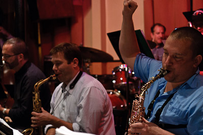 Keith Pray stands to blast an alto sax solo. Rudy Lu photo