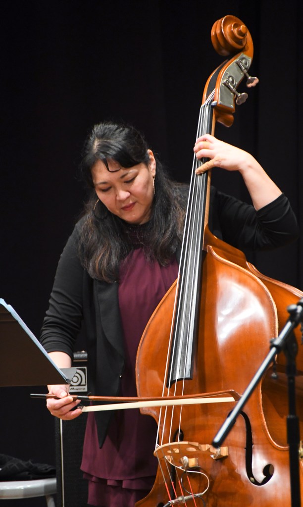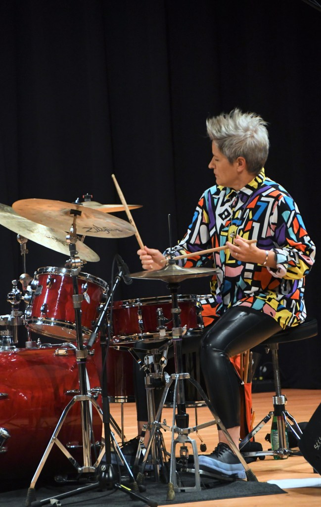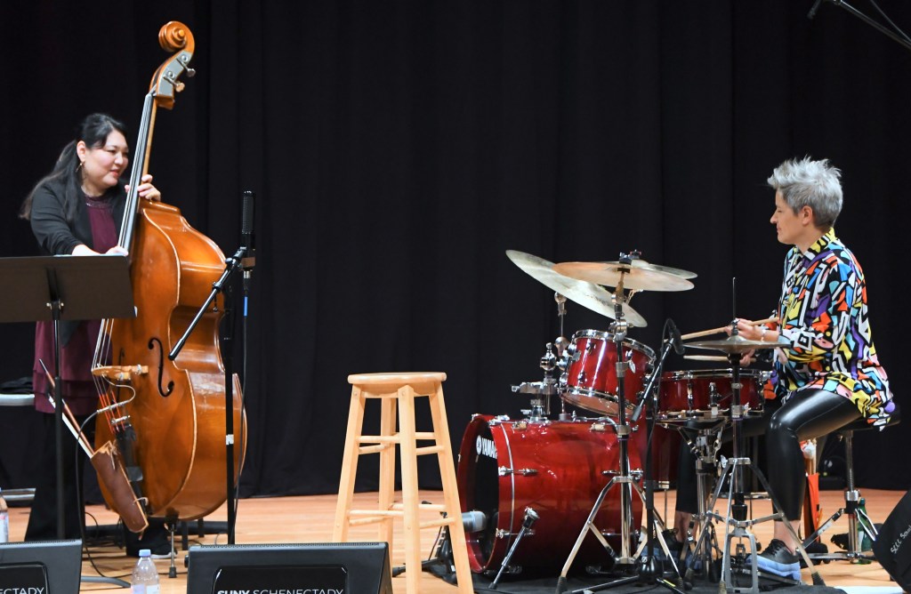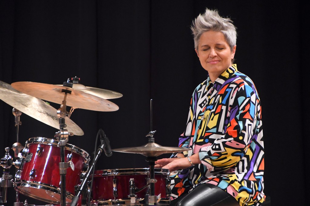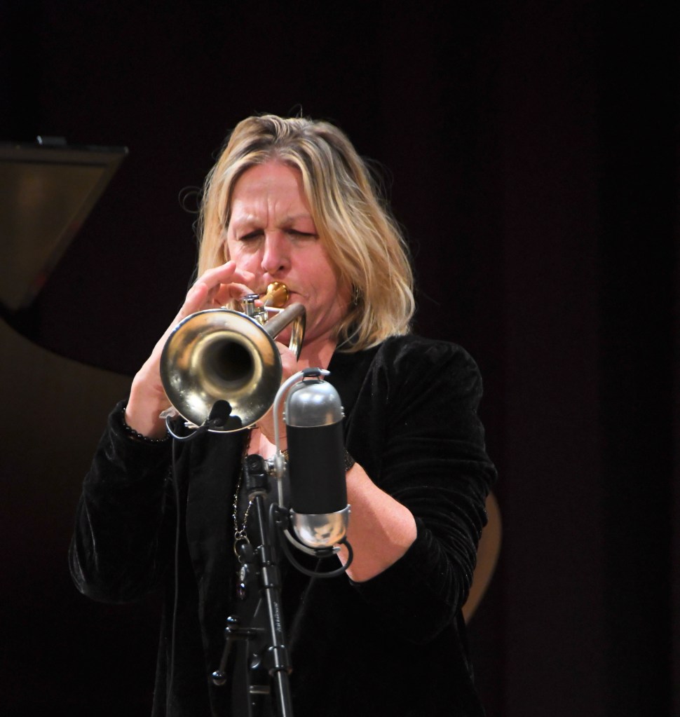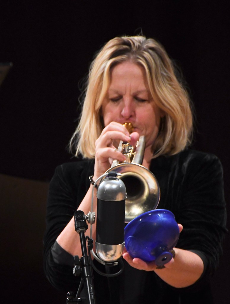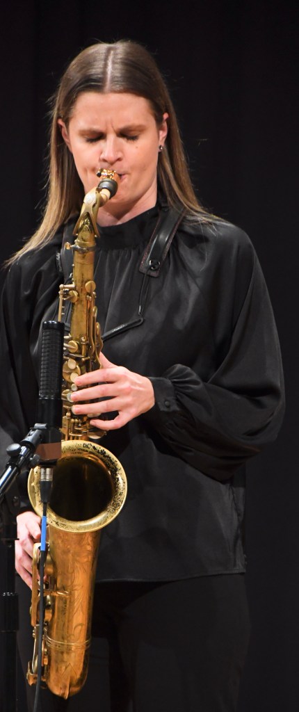 Everybody helped everybody, especially Jensen, who stepped toward the wings at times, when not soloing (as did Glover) or riff-bonding with Glover’s tenor. Always listening, she gave a supportive glance-as-applause when Ueda hit a particularly apt riff in “Galapagos,” for example, and an awed “Woooo!” to Allison’s fireworks in the same tune. Jensen also adjusted her horn and its electronic interfaces often, and it always sounded right.