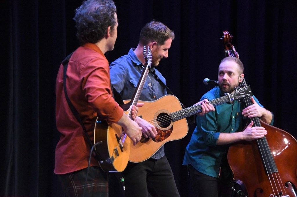 MacCrimmon’s bouzouki blended beautifully with Moynihan’s fiddle and vocal in the early verses of “Changing World,” then his voice did the same with hers in the harmonized coda. This one medleyed, too – Robertson, MacCrimmon and Lindsay stepping to the front, standing close and swapping percussive riffs in “Striking Clock” with its stop-and-go coda.
