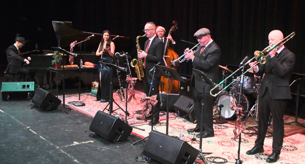 It’s A Jazz Christmas, from left: David Gleason, piano; Hannah Amigo, vocals; Brian Patneaude, saxophone; Mike Lawrence, bass; Chris Pasin, trumpet; Pete Sweeney (obscured by) Ben O’Shea, trombone