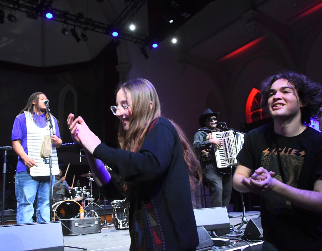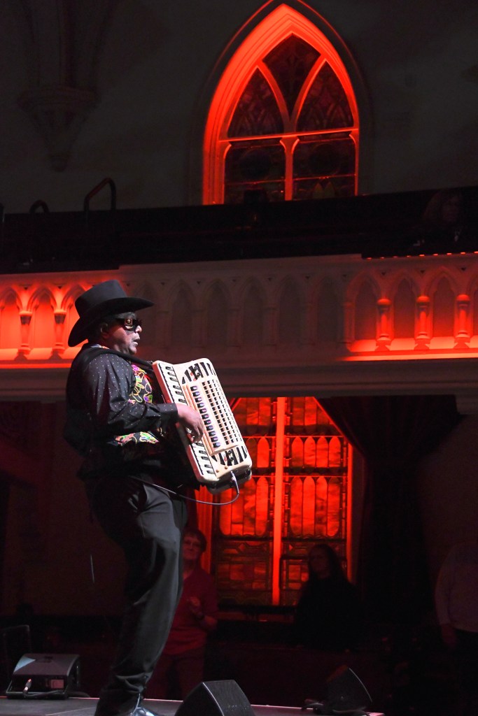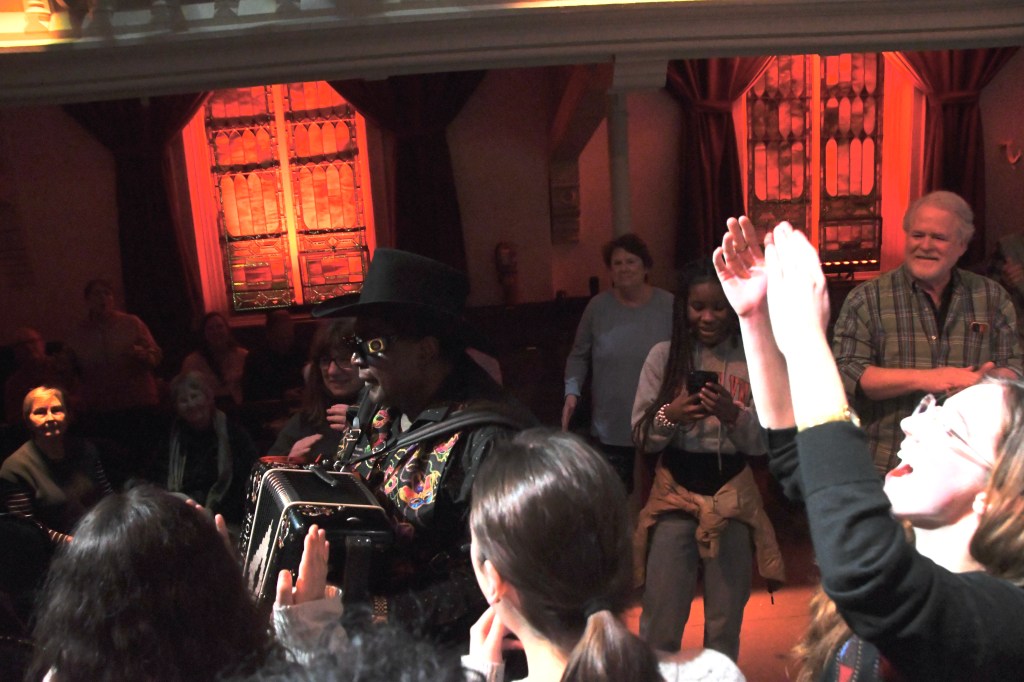 The band set fire to zippy two-steps, waltzes fast or slow, and a chill-out cha-cha or two – one called “Zydeco Cha Cha,” of course. Nathan sang in English or French and traced his musical roots back to where “crawfish got soul and alligators get the blues.” After most tunes, he playfully asked, “Was that all right to you?” – and reaped the affirmation it deserved.