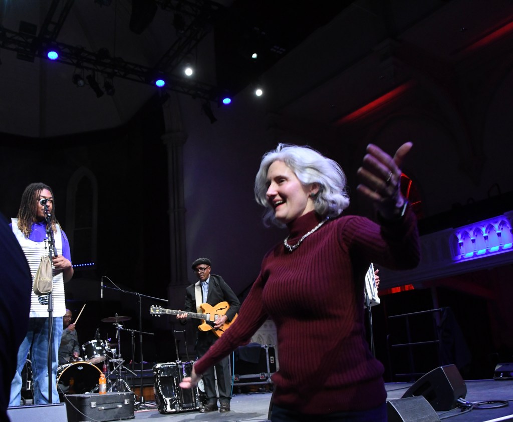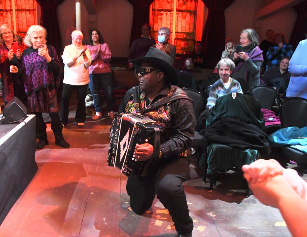 No problem: “Sid-O’s Zydeco Boogaloo” – or was it the other “Zydeco Boogaloo”? – re-energized band and fans as Nathan went wireless and wandered the house, playing, grinning, sitting down among his fans, dropping to one knee to acknowledge dancers by the stage.