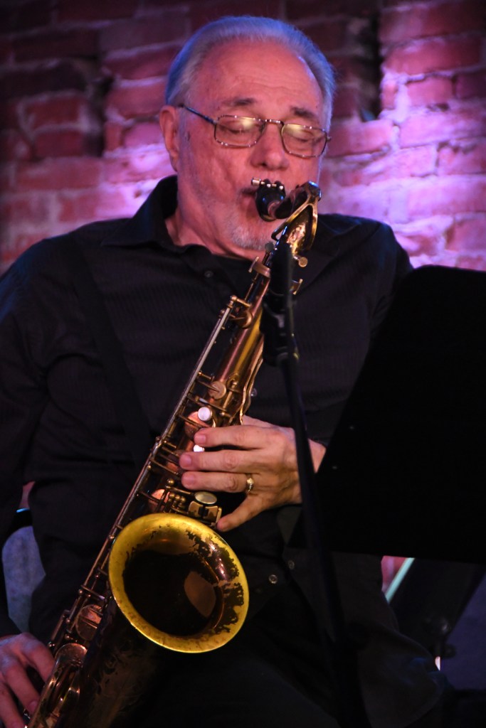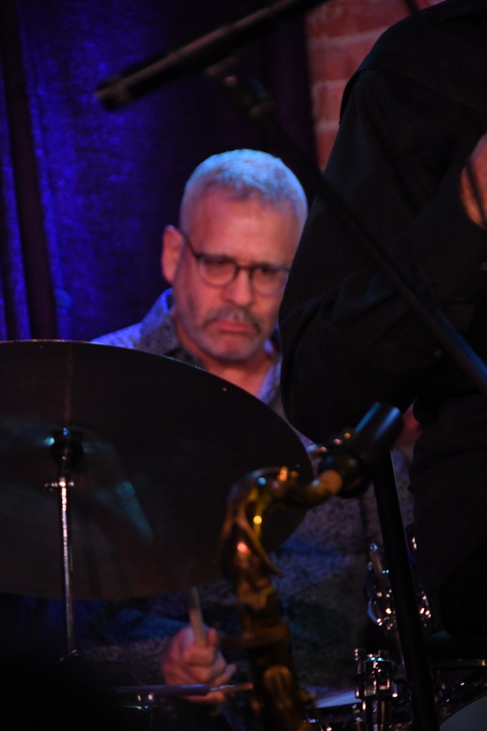 Pete’s synthesizer mostly emulated a piano but beefed up to a menacing organ sound in “Wolfsbane” – as Tony left his electric upright for a five-string bass guitar – and resonated with a Fender-Rhodes-like ring in Wayne Shorter’s lovely “Fall.” LaBarbara switched to tenor first in “Dream Steps,” an original bebop based, he said, on “You Fell Out of a Dream.” He said this came from a 40s film starring Lana Turner, whose entrance to nightclubs thereafter detoured jazz bands from whatever they were playing to greet her with “Dream.” Mock-cranky, LaBarbara complained bands don’t do that when he comes in. Such self-deprecation marked many intros, especially Pete’s, but their playing blew away any need for it.