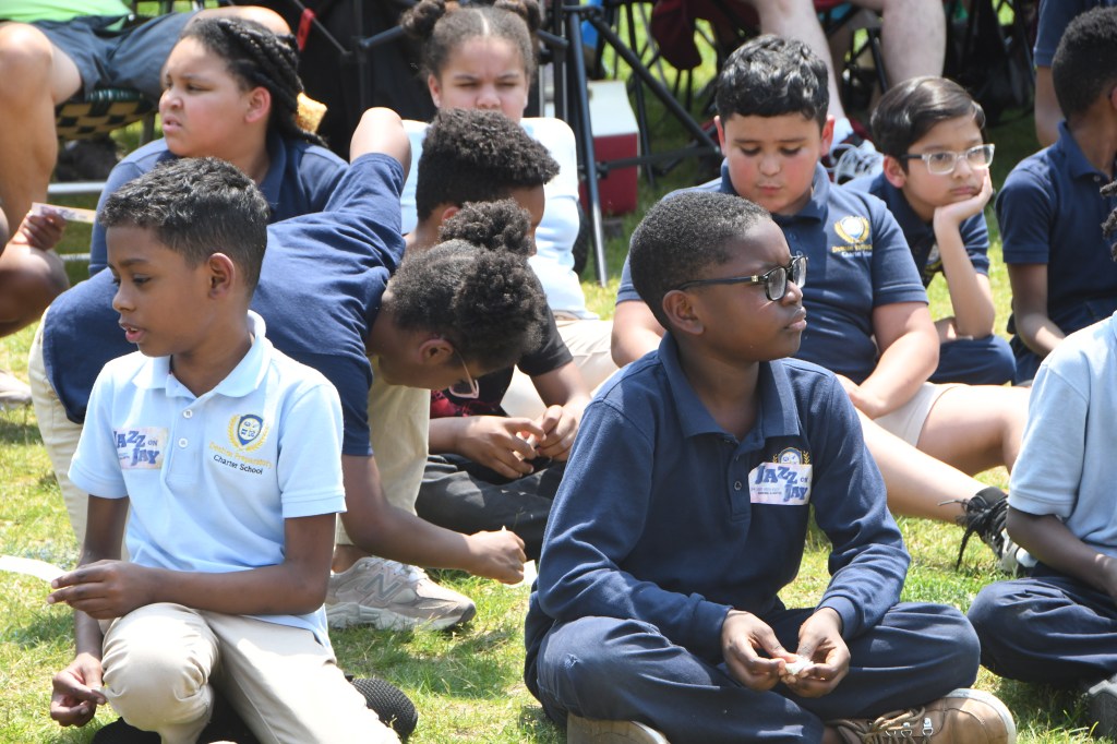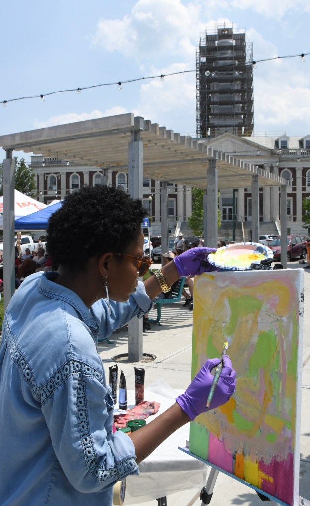 Sultry air – 88 degrees at show time, and throughout – drove fans under the four tents that organizers kindly provided, taking refuge from heat that almost, almost, discouraged Steve Nover from dancing. A few dozen third-graders marched in from the nearby charter school to sit in sometime fidgety rows up front. Discovering painter Ubu working in the wings off stage right, they clustered around her and she invited a few of the braver ones to help. Sweet.