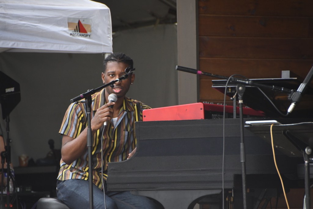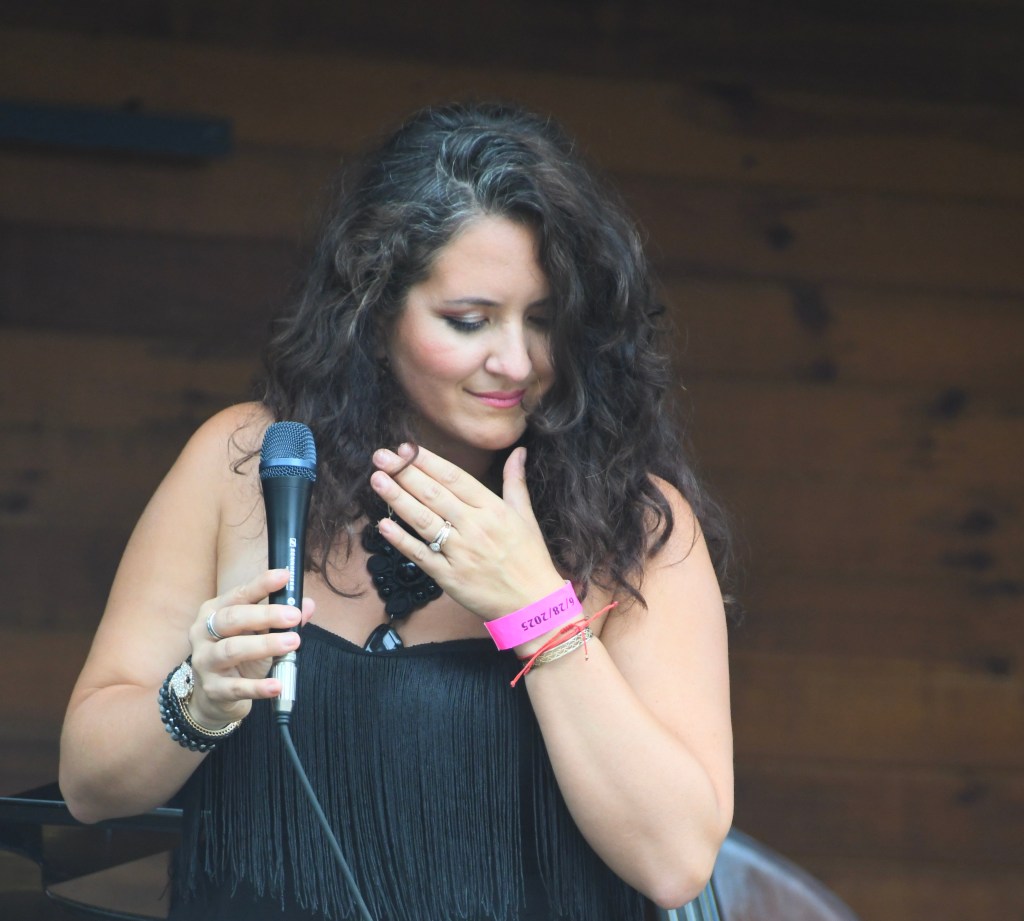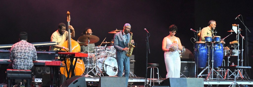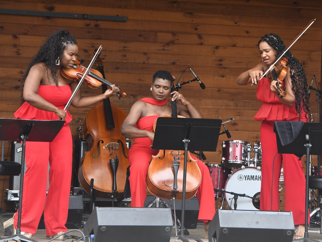 Saturday of the weekend-long two stage festival opened with the String Queens. The violin-viola-cello trio medleyed “The Battle Hymn of the Republic,” “America the Beautiful” and “Lift Every Voice and Sing,” anthems for equality. They also blended Pachelbel’s Canon with the Beatles’ “Eleanor Rigby” and swung together 90s R&B and hip-hop; also “Summertime” with “Human Nature,” then “Isn’t She Lovely.” Most was, flowing smoothly, but pizzicato cello punched up “My Favorite Things” as violin and viola bowed hard, making fiery sound of the classical-into-jazz philosophy violinist Kendall Isodore called “putting some stank on Mozart.”