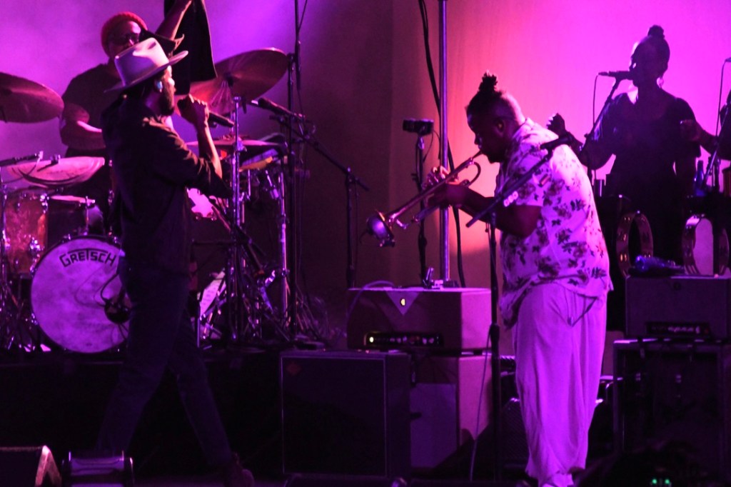 Gary Clark Jr. sings, second from left, as trumpeter Keyon Harrold, second from right, guests