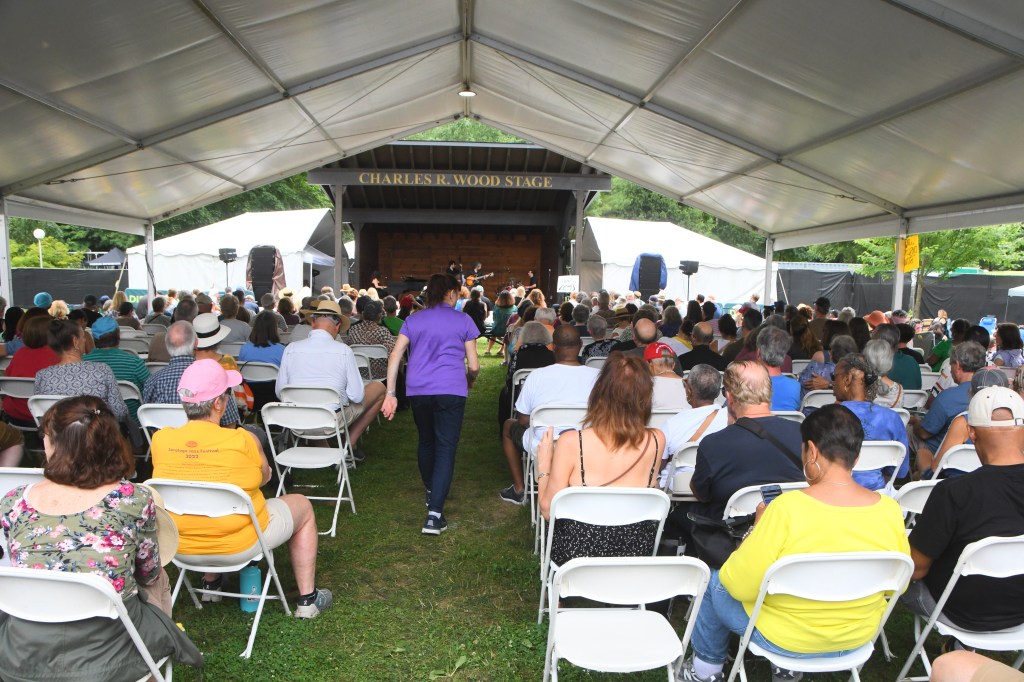 Festival producer Danny Melnick introduces Saturday’s first act at the Saratoga Jazz Festival
