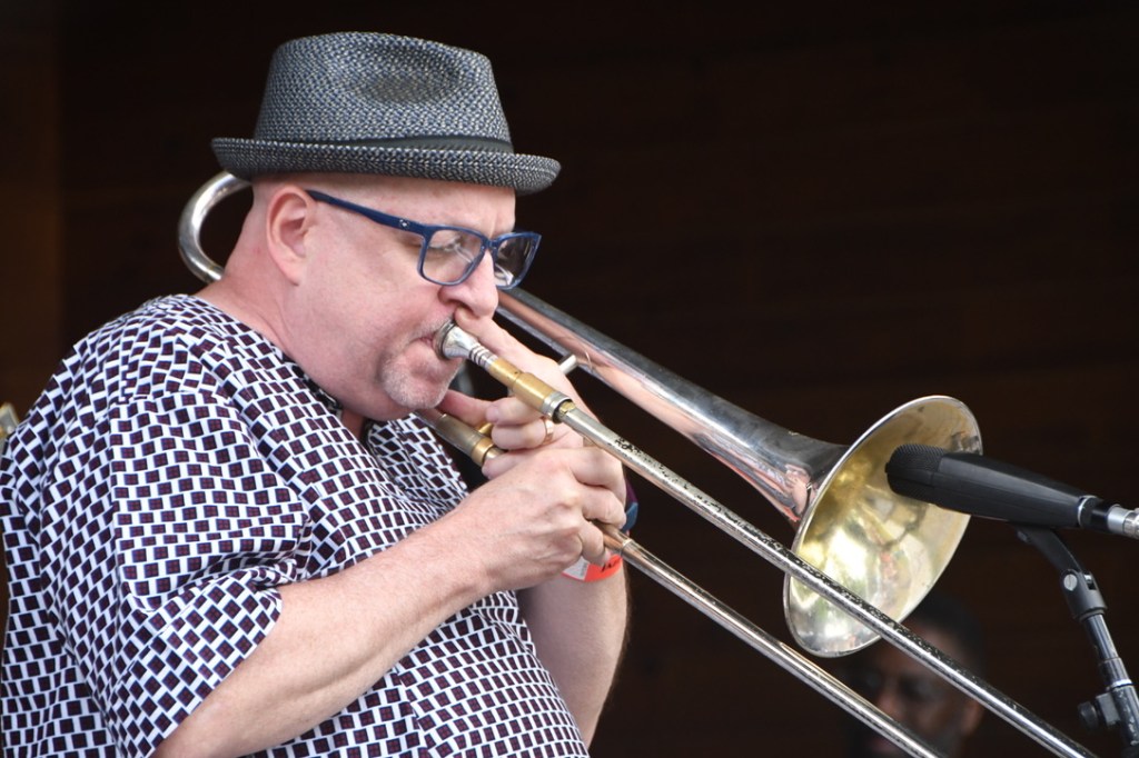 Hours before the New Orleans trombonist, trumpeter, leader and party catalyst celebrated his New Orleans hometown – where he owns closing-set honors at Jazz Fest – the Saratoga fest’s sunny Sunday began with the cerebral, traditional Skidmore Jazz Institute Faculty Combo. Trumpeter-singer Bria Skonberg’s spirited Louis Armstrong/New Orleans-inspired highlight set bridged the gap between listening calmly to the Combo’s or unanimous crazy with Trombone Shorty.