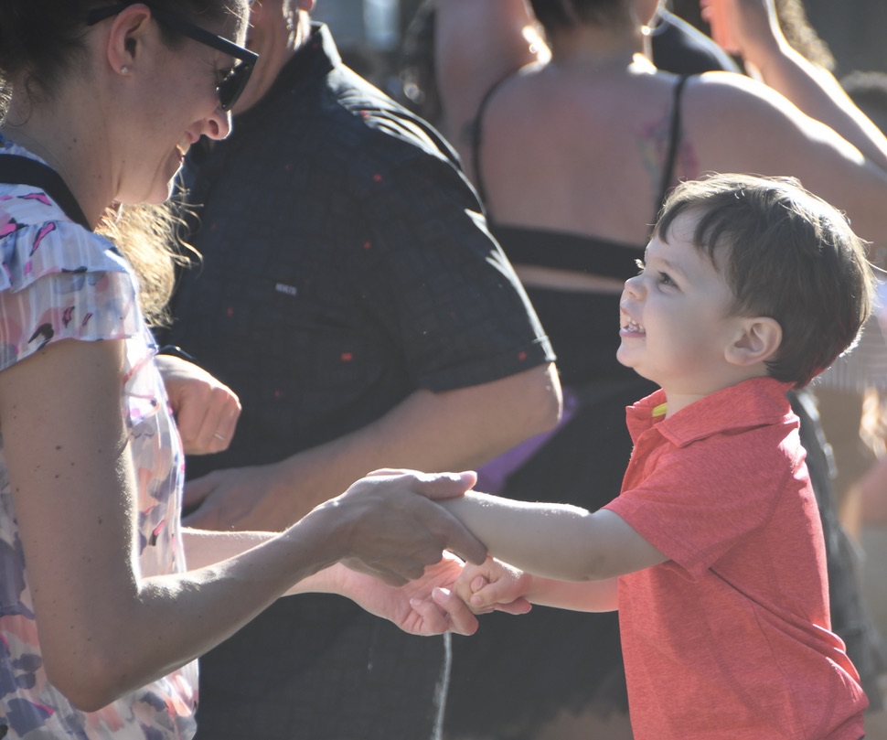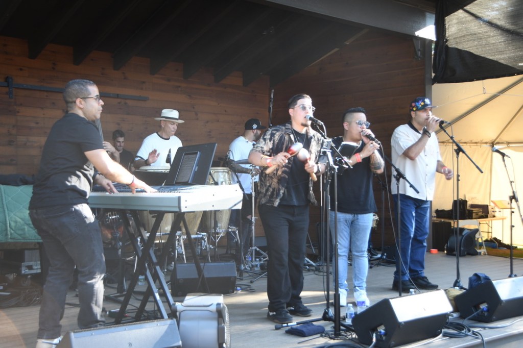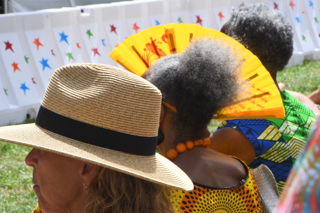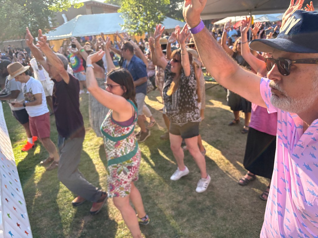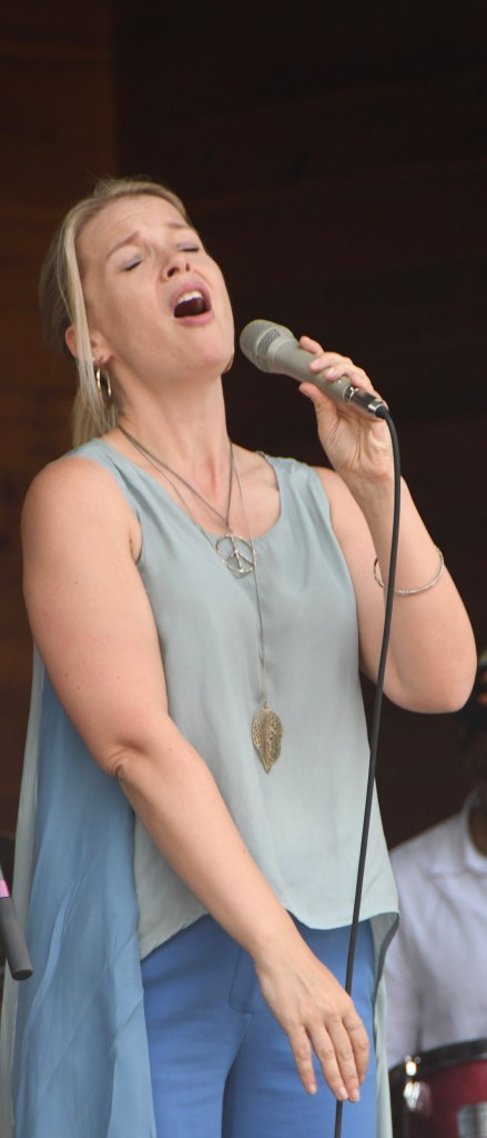 The Wood Stage closed with a big band, like it began. But the 11-piece Latin La Excelencia got everybody dancing, unlike the cerebral Skidmore Jazz Institute Faculty Jazz Combo. Horns blasted from behind and percussionists between them and the singers up front ganged up on the beat – all bouncing hard to emphatic conducting by pianist Willie Rodriguez. The New York-based band sang for social justice, as the String Sisters and Gregory Porter did Saturday, wrapping messages in irresistible salsa and meringue beats. The grassy area before the stage filled from their first song, the air dusty and full of smiles.