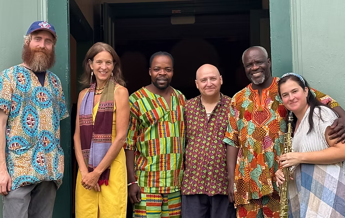 Keyboardist-founder Elizabeth Woodbury Kasius, bassist Bobby Kendall and drummer Brian Melick are busy locals. Woodwinds player Laura Andrea Leguia played for 20 years with the Gabriel Alégria Afro Peruvian Sextet, drummer Zorkie Nelson played with Ghana’s Pan African Orchestra and now leads the area’s West African dance and percussion ensemble Gballoi; his daughter, dancer Augustina Nelson, is a member.