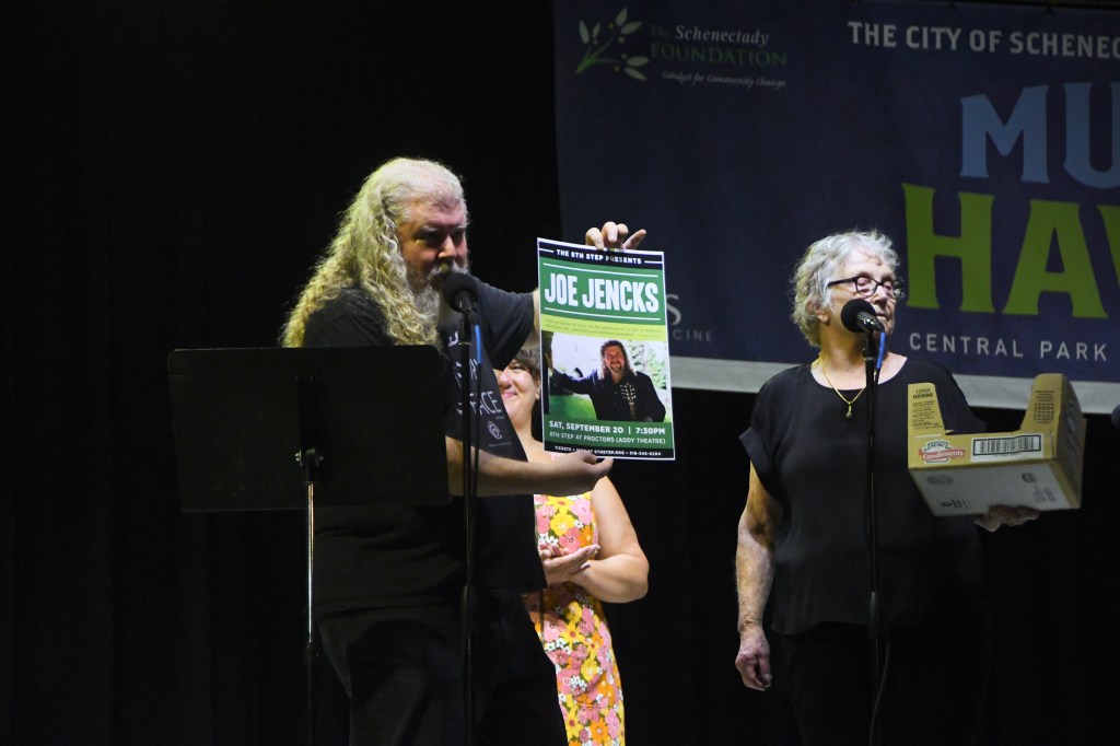 Joe Jencks touts his Sept. 20 Eighth Step show during the raffle, with Sarah LaDuke, behind Jencks, and Wanda Fischer
