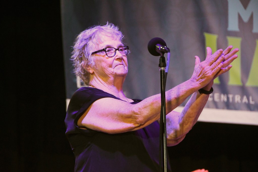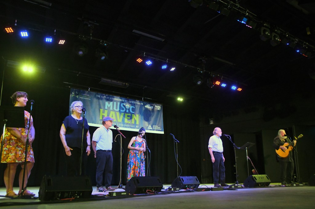 Wanda Fischer marked 43 years as host of WAMC’s “Hudson River Sampler” with folksinging friends at Music Haven Saturday. Celebrating folk’s durability, and Fischer’s, fell on Woodstock weekend, 66 years after the festival that forever changed pop music: It was never so diverse thereafter, but more profitable. Most in Saturday’s crowd fit the coulda-been-there boomer demo.