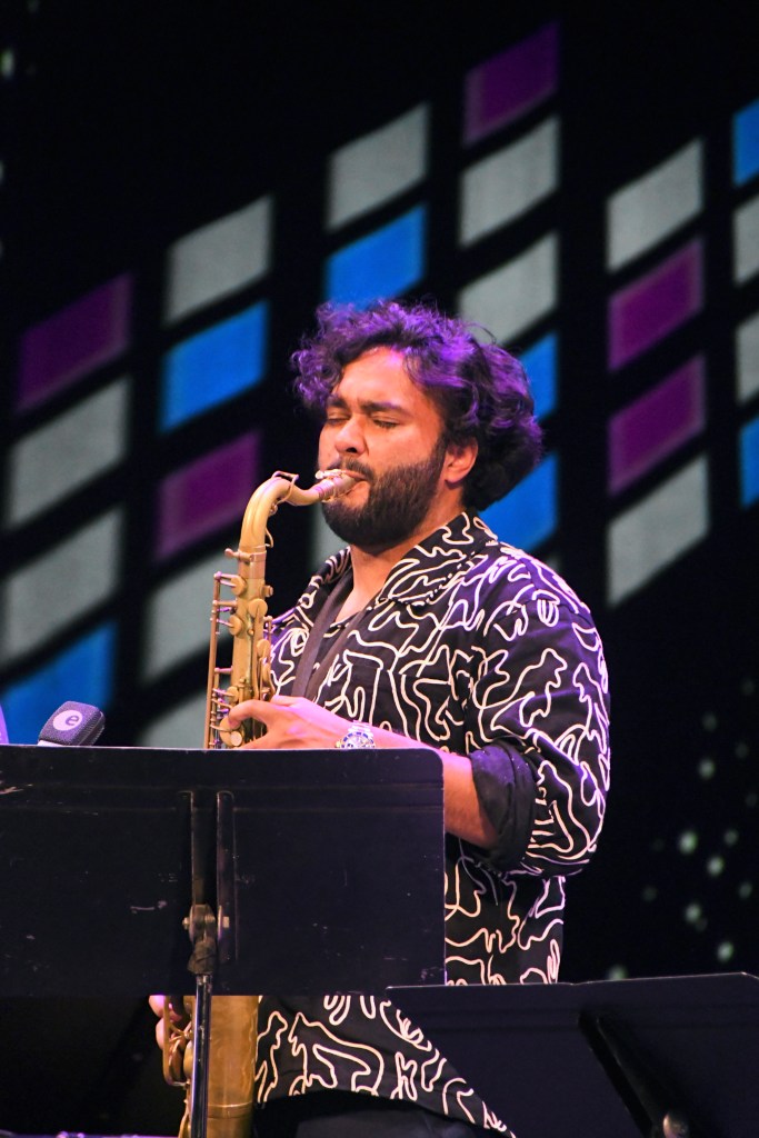 At Music Haven in Proctors Sunday, he led a big band, his World Ensemble. Before calling the roll by player and country, Castaneda showed off uncanny speed, restless melodic invention and pulsating rhythm in a breathtaking intro-eruption before anybody else played a note. Then everybody played lots of notes in the dense, staccato suite “Tabom.” First, Rogerio Boccato (Brazil) hit a repeating triangle figure, then a groove-and-solos machine formed. From stage right they were keyboardist Helio Alves (Brazil); flautist Itai Kriss (Israel), trombonist Ryan Keberle (US), saxophonist Birsa Chatterjee (India), chromatic harmonica player Yotam (Switzerland), drummer Julian Miltenberger (US) and Castaneda playing the most amazing stuff, stage left.