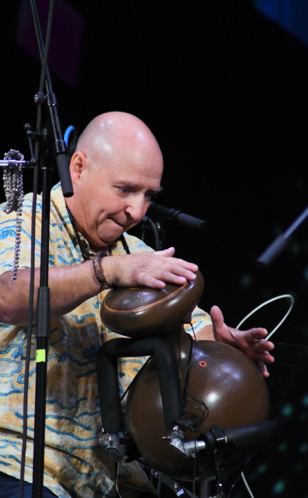 Melick started solo at the molded clay udu drum, making deep swoops of “Udu Play Clay.” He then introduced his collaborators in duets. Flamenco guitarist Maria Zemantauski kept pace with Melick’s udu in her percussive fingers-flying “Rosita.” Keyboardist (and leader of world-jazz combo Heard; Melick is a member) Elizabeth Woodbury Kasius conjured Montreal snow in “Cote Des Nieges,” Melick’s lacy, tinkling hand percussion evoking bright flakes falling over her graceful melody. Singer Shiri Zorn recited a poem on love versus solitude to introduce “Alone Together,” a complex jazzy, torch-song with recorded voice tracks harmonizing her voice as Melick underscored everything with woody cajon riffs.