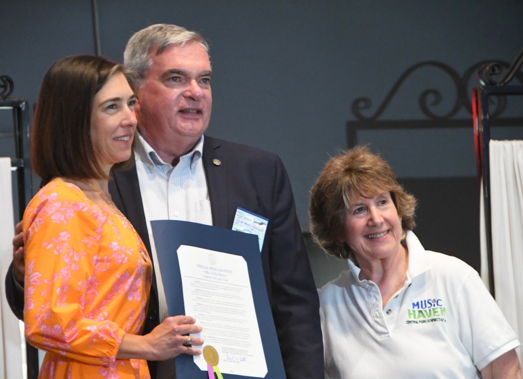 From left, above: Anne Putnam, Schenectady Mayor Gary McCarthy, Music Haven Producing Artistic Director Mona Golub. Below, from left: Putnam, NYS Senator Jim Tedisco, and Golub