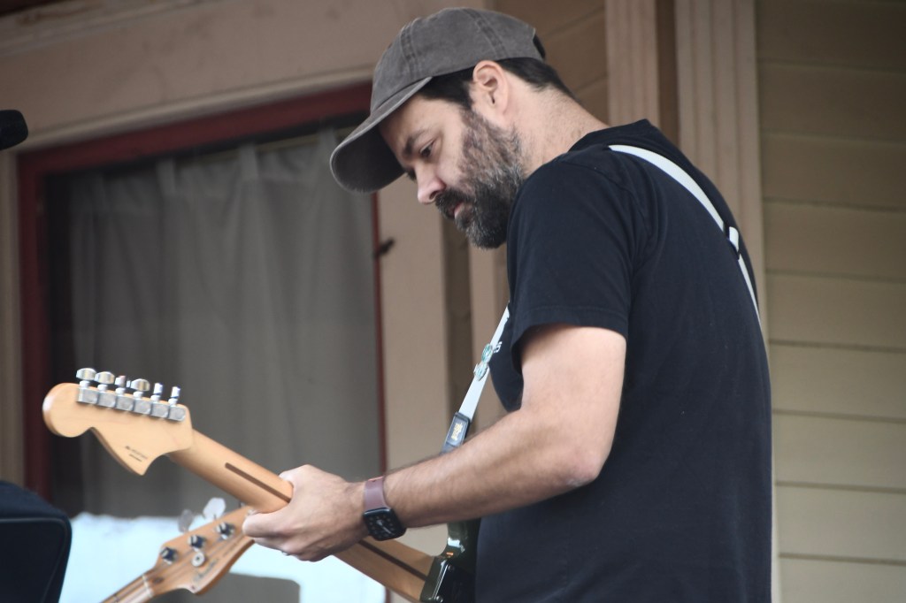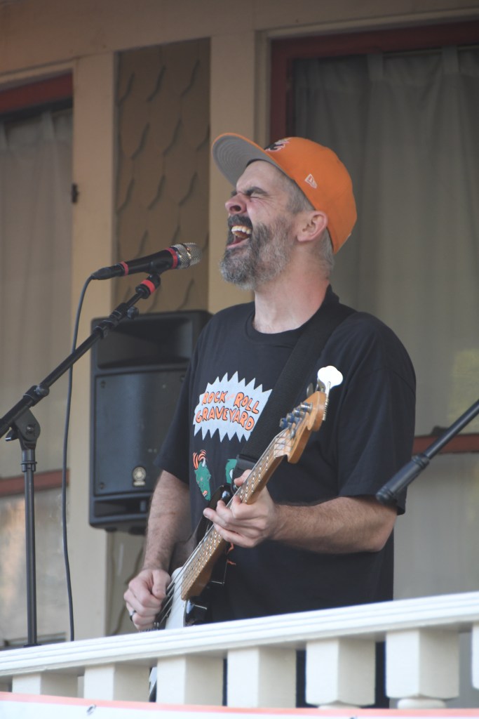 In 2024 Porchfest, the COVID-positive Rogers had to play from his own living room, looking through its bay window at his bandmates. Saturday, he joined guitarist Eric Ayotte and drummer Harrison Schmitt on the porch where they started with “Siren Swell” about the scream of ambulances passing on Rugby, a busy route to Ellis Hospital. Even that song sounded happy – and so did others about taking nights off to relax from over-busy lives, how life is better together and how to keep toddlers entertained.