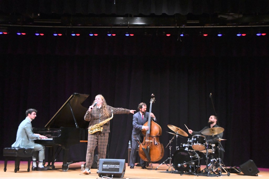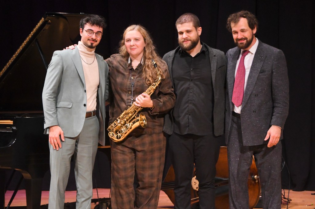 Sarah Hanahan Quartet, from left: pianist Caelen Cardello, alto saxophonist Sarah Hanahan, bassist Matt Dwonszyk and drummer Sam “Bang-Bang” Bolduc