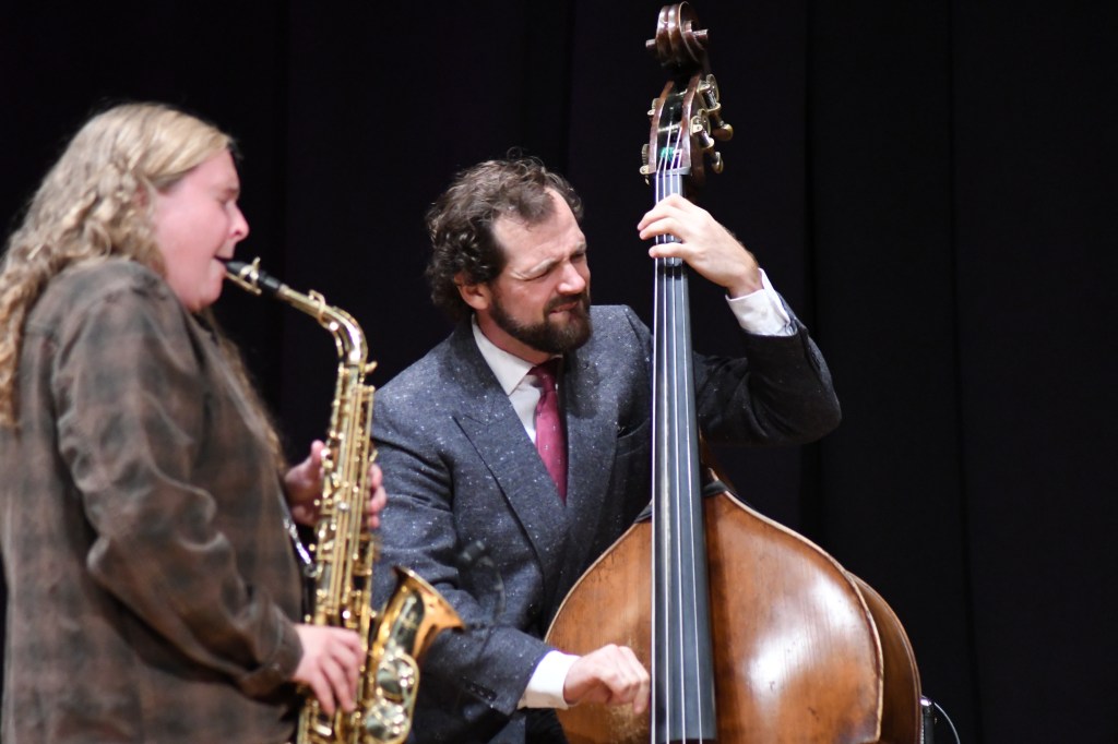 Hanahan introduced her players with affection, repeating their names like a carnival barker. She said she’d met Cardello in Joe Farnsworth’s band and shanghai’ed the hyper active pianist for her own crew before noting he returns to A Place for Jazz with singer Tyreek McDole Nov. 7. She praised Dwonszyk’s rainbow-like bass playing and told how a random sign in a midwestern bar inspired drummer Bolduc’s nickname “Bang-Bang.”