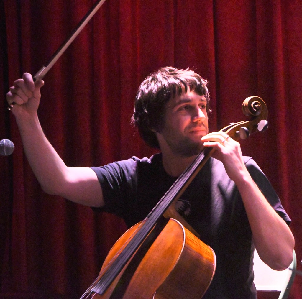 Above: Hoke’s Floating Zone Band, from left: fiddler Matt Combs, cellist Austin Hoke, percussionist Kirby Shelstad, Jim Hoke playing pedal steel, drummer Ben Parks, guitarist Chris Cottros and bassist Dave Francis. Below: Austin Hoke, cello, at left; Hoke at the pedal steel