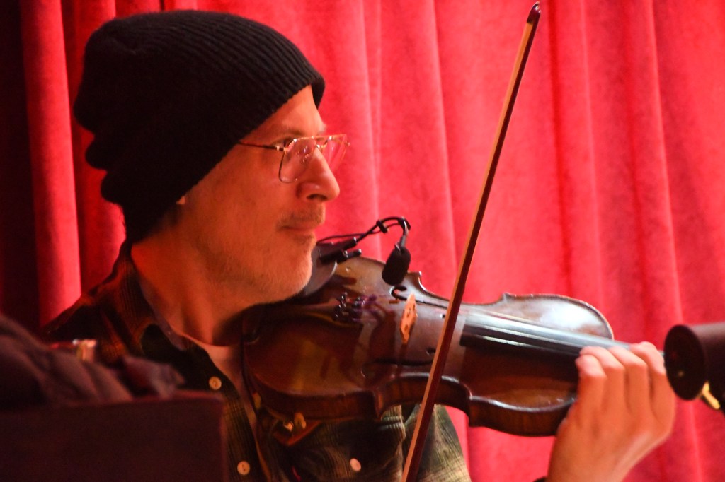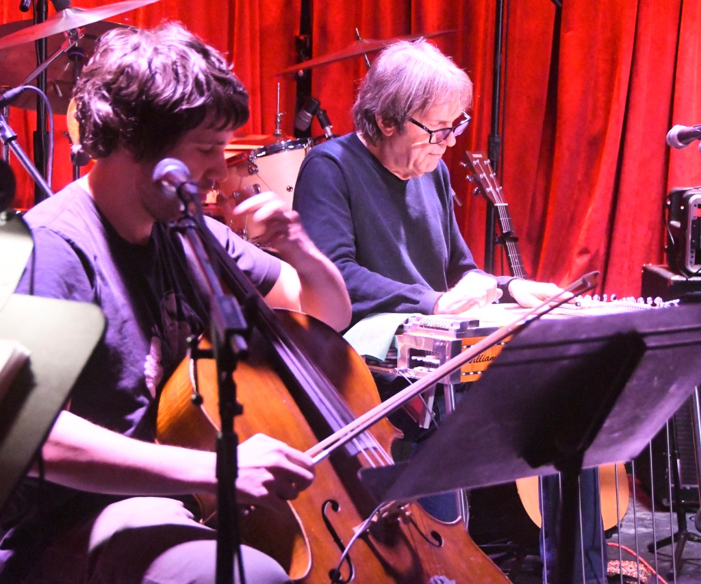 It all began with pedal steel (by Jim) and cello (by son Austin) duets of a spiky, sparse beauty in Milhaud’s “Sumare” and playful jazz lilt in Zappa’s “Ay Bee Sea.” Then the band joined, a player or two at a time, to gang up on Jim’s pop numbers, first the instrumental “Grim Determination,” then the romantic desperation of “If You Change Your Mind” – first number at full, formidable strength, and first vocal tune, with close harmony by Jim’s collage-artist-pianist-singer and cultural catalyst wife Lisa Haddad.