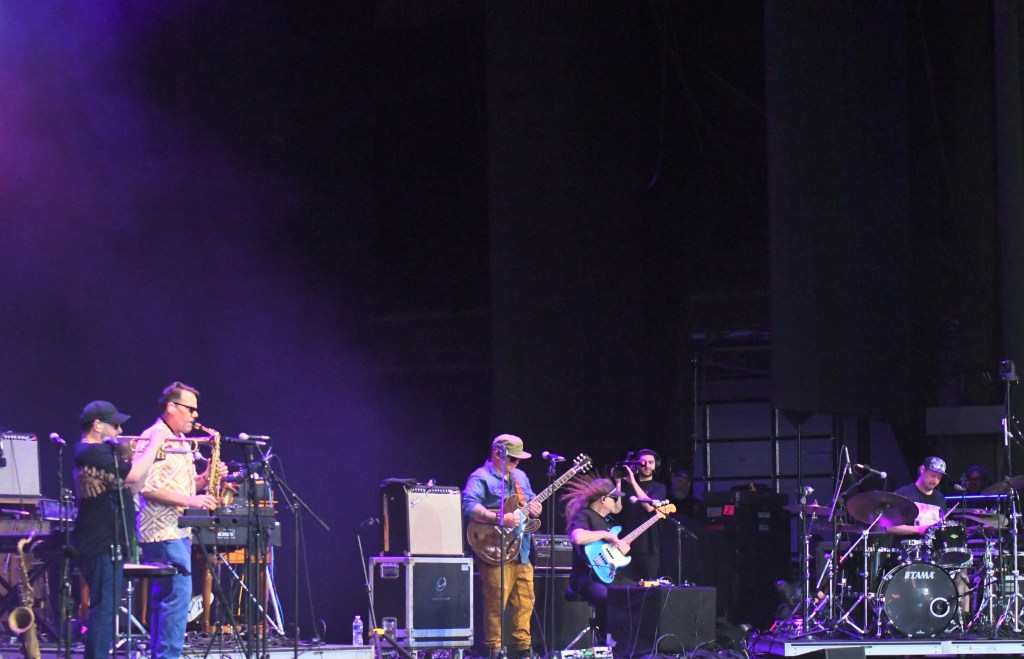 Lettuce at SPAC on June 28, 2025; from left: Eric “Benny” Bloom, trumpet; Ryan “Zoid” Zoidis, saxophone; Adam “Shmeaans” Smirnoff, guitar: Erick “Maverick” Coomes, bass; and Adam Dietch, drums. Keyboardist/singer Nigel Hall is obscured behind the horns at stage right.