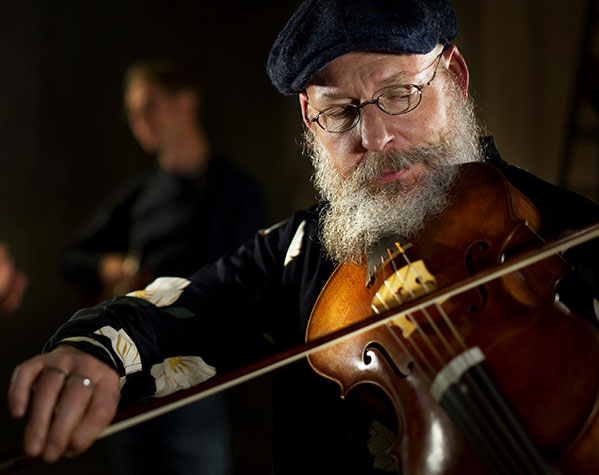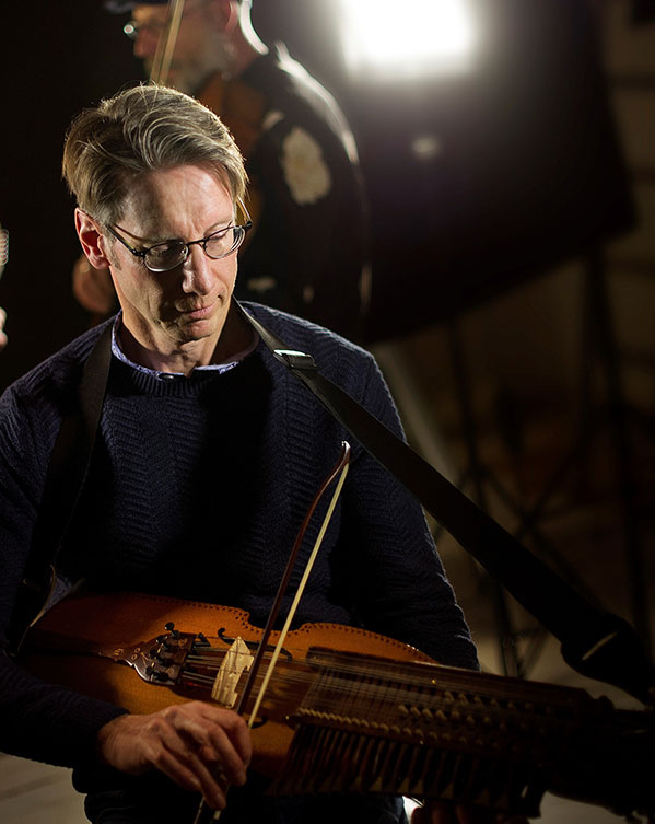 And if you think that looks strange, check out Olov Johansson (no beard) who bows what looks like a violin that got all ripped at the gym, then blundered into a woodworking shop where beefy structures were hammered onto the bottom. It sits across his knees, like Jerry Douglas holds a dobro, and its complex hardware transforms its sound the way chord bars of an autoharp expand the look and language of a zither. This 14th century contraption is the Nyckelharpa, a keyed fiddle with three melody strings whose pitch changes as keys, in three rows across the bottom, raise and lower wooden pins against them from underneath, a bit like a pedal steel, There’s also a drone and a dozen strings that never get plucked or bowed but vibrate in the air currents of the melody strings.