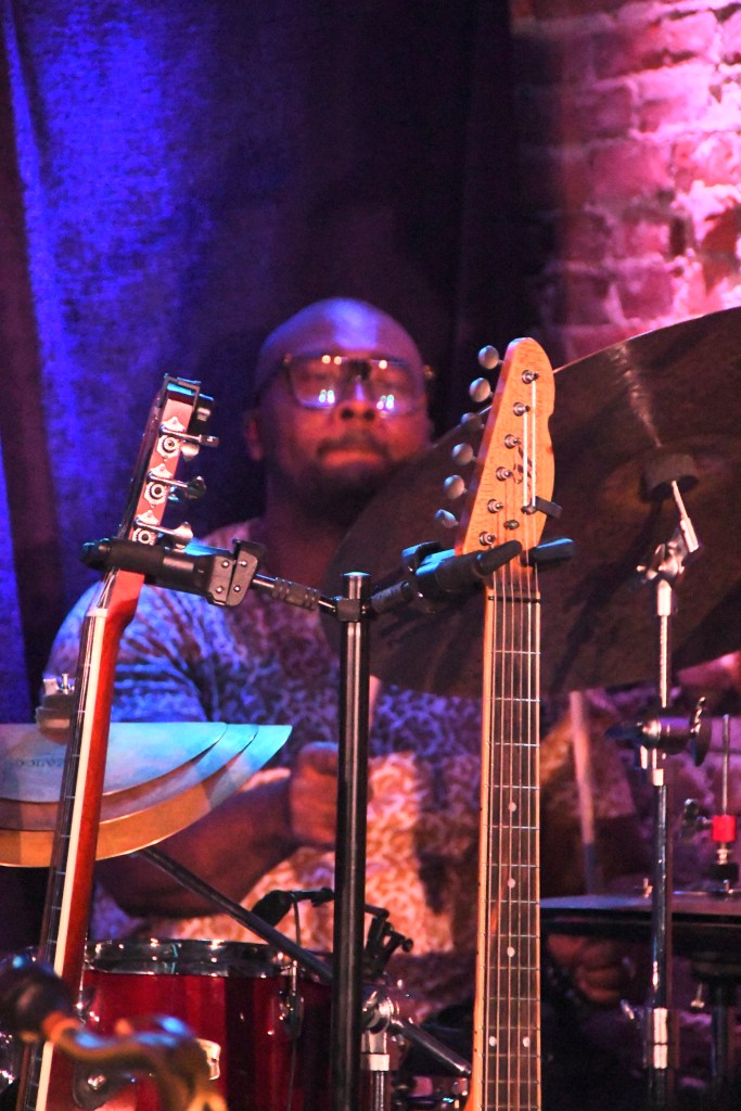 Those two held eyes and ears with such confident easy, unified musical force that we could almost take for granted workmanlike drummer Byron Cage and bassist Justice Guevara, toiling solidly away on muscular beats. Almost.